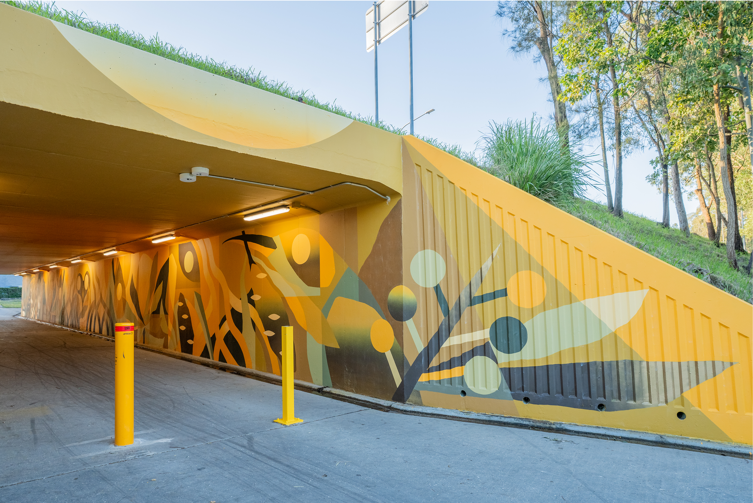Transforming the Helensvale Underpass, Estuary Dawn invites connection with light, movement, and place. Referencing the tidal rhythms of nearby Coombabah Lake and Coomera River, Al Stark’s immersive design features mirrored forms, sequenced colour, and tonal gradients that echo local ecologies. CREATIVE ROAD developed the curatorial framework, managed artist commissioning, and led stakeholder approvals. The result enhances both wayfinding and safety after dark, while offering a culturally and environmentally grounded experience for everyday users.