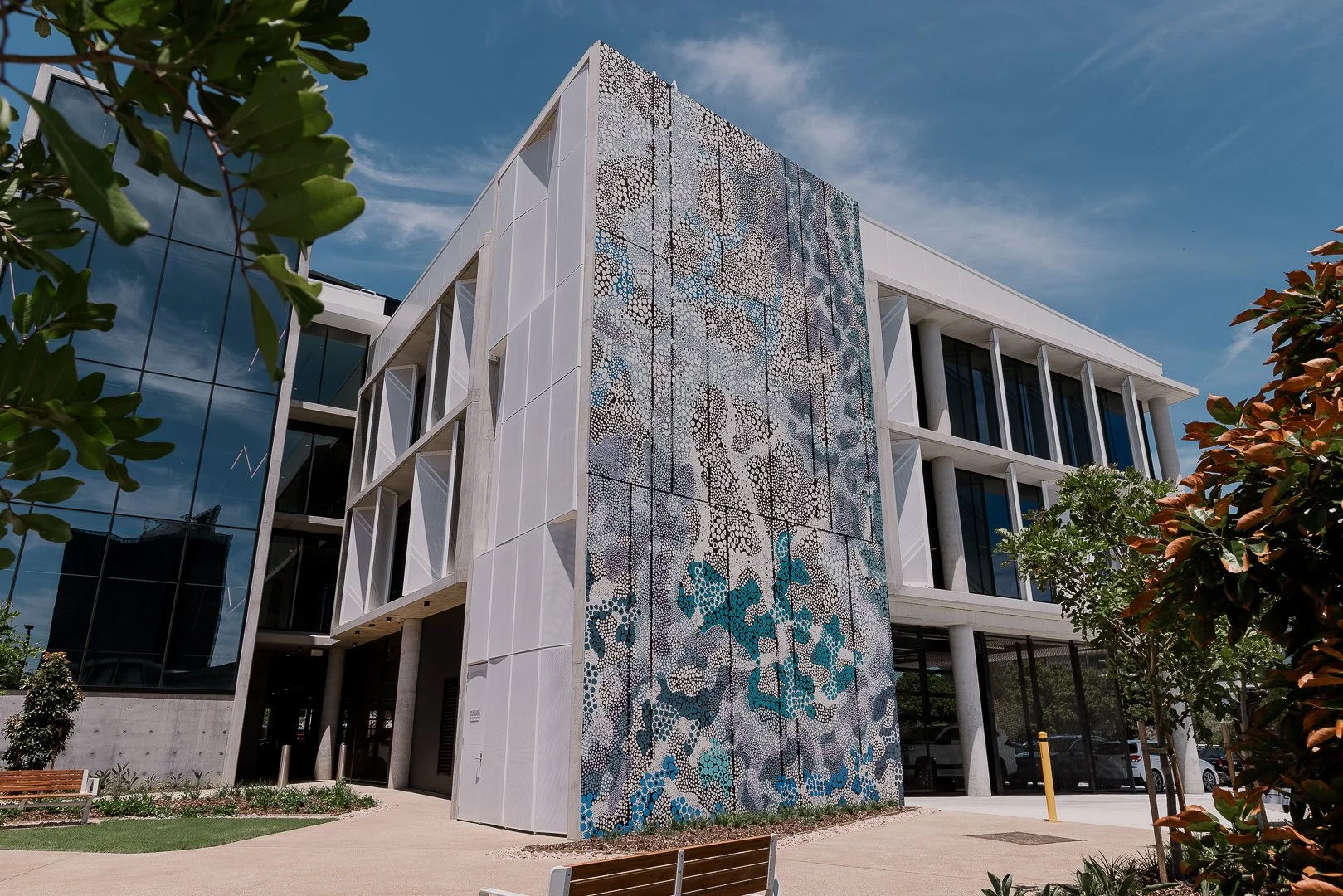 A hand-painted artwork façade-integrated artwork translating cultural knowledge into contemporary architecture, the design references local waterways and saltwater heritage through layered abstraction and rhythm. As the artist’s first public commission, the project marked a significant career milestone—expanding practice and opening pathways for future opportunities.